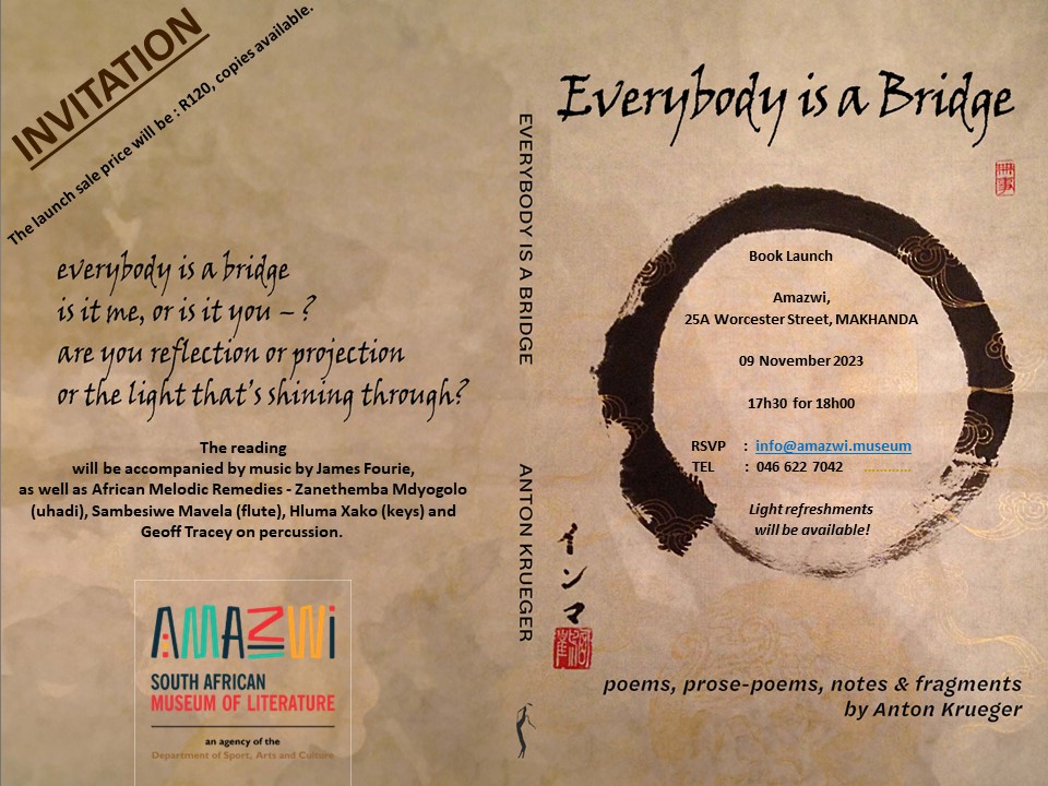 On Thursday, 9 November, Anton Krueger will be reading from his new collection of poems Everybody is a Bridge, (Botsotso) in collaboration with musical accompaniment by African Melodic Remedies, a collection of musicians from the Eastern Cape, headed by Zanethemba (Zane) Mdyogolo. The team for the evening also includes Sambesiwe Mavela (flute), Hluma Xako (keyboard) and Geoff Tracey on percussion, with a guest appearance by James Fourie.